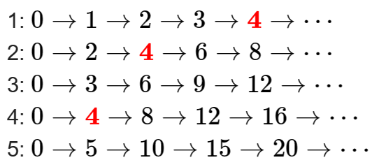 Xem dạng PDFTrong một buổi kiểm tra nhảy xa, Loli - một thầy giáo đáng iu đang kiểm tra một nhóm ~n~ bạn nữ. Loli tạm đánh số các bạn từ ~1~ to ~n~, và các bạn đều đang ở vị trí ~0~. Bạn ~i~ có khả năng nhảy xa ~a_i~ đơn vị (từ vị trí ~x~ nhảy đến vị trí ~x+a_i~). Mỗi một đợt nhảy, bạn ~i~ nhảy xa ~a_i~ đơn vị về phía trước.
