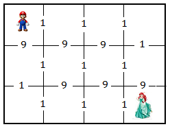 Mụ phù thủy có một khu hầm hình chữ nhật gồm ~n \times m~ căn hầm. Các căn hầm được đánh số từ dòng từ ~1~ đến ~n~ theo chiều từ trên xuống dưới, đánh số cột từ ~1~ đến ~m~ theo chiều từ trái qua phải. Giữa hai căn hầm sát nhau có cửa thông nhau mà phải mất một khoảng thời gian nào đó mới có thể mở cửa để đi từ căn hầm này sang căn hầm kia. Sau khi bắt cóc công chúa, mụ phù thủy giam nàng tại căn hầm cuối cùng ~[n,m]~ - dòng ~n~ cột ~m~. Chàng thợ sửa ống nước Super Mario đang ở căn hầm đầu tiên ~[1, 1]~. Bạn hãy tìm các căn hầm mà Mario phải đi qua để giải cứu công chúa một cách nhanh nhất.