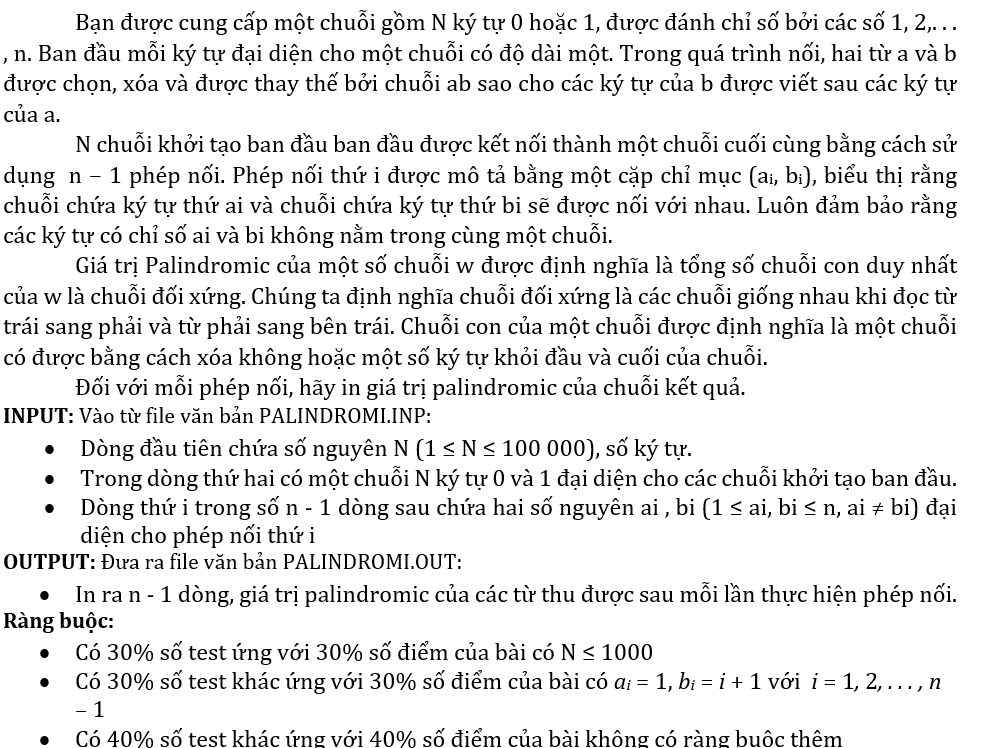 Các giá trị palindromic tương ứng được đưa ra trong đầu ra ví dụ. Ví dụ. giá trị palindromic của 00100010 là 8 vì chuỗi chứa 8 chuỗi con palindromic: 0, 00, 000, 10001, 0100010, 1, 010, 00100.