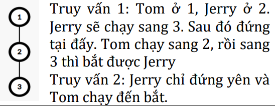 Mỗi một đơn vị thời gian thì Tom và Jerry có thể lựa chọn chạy từ phòng này sang phòng kia, hoặc có thể đứng im trong phòng, biết rằng chúng nhìn thấy nhau trong cả ngôi nhà. Khi Tom và Jerry cùng ở một phòng, thì Jerry lại phải nghĩ cách troll Tom để chạy thoát. Cho ~Q~ truy vấn, mỗi truy vấn cho vị trí của Tom và Jerry, hỏi cuộc dượt đuổi được lâu nhất là bao nhiêu thì Jerry lại phải troll Tom.